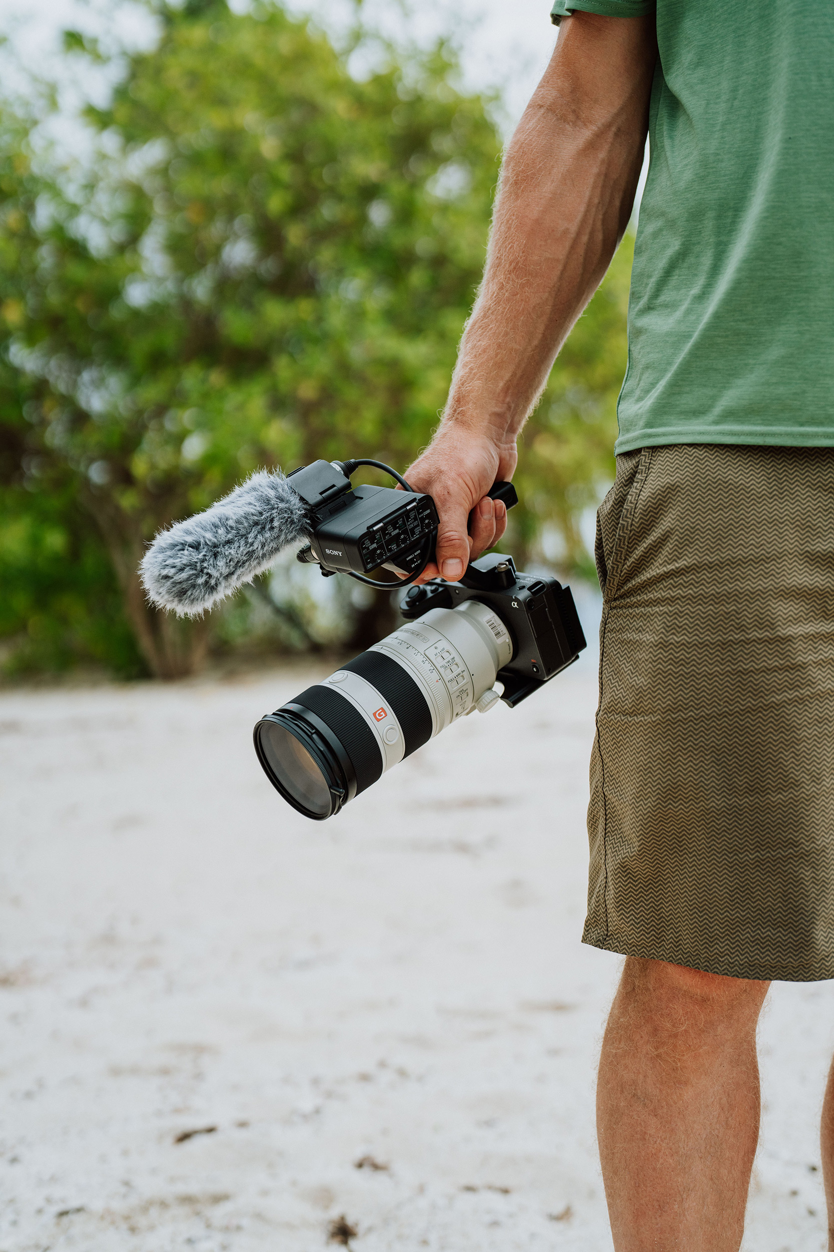 Wie bereits erwähnt, arbeite ich viel mit der FX6 und der FX3. Darum habe ich zunächst überlegt, meine bevorzugten G Master-Objektive zu verwenden: das 16-35mm f/2.8, das FE 24-70mm f/2.8 und das FE 70-200mm f/2.8 mit einem 1.4x Extender. Für einige Aufnahmen des Films kamen auch das E 16-55mm f/2.8 und das E 15mm f/1.4 zum Einsatz. Diese Objektive sind extrem kompakt, sodass sie sich für eine Wanderung durch den Dschungel hervorragend eignen. Für die Wasserszenen habe ich die Sony FX3 in das Unterwassergehäuse von Salty Surf gesetzt – und es hat perfekt gepasst. Das Projekt war nicht auf Live-Sound angewiesen, doch die Verwendung eines Onboard-Mikrofons war für die Aufnahme der natürlichen Umgebung sehr wichtig, da es das Sounddesign erheblich vereinfachte. Dazu verwendete ich den oberen Griff mit dem Sony K3M Shotgun-Mikrofon.