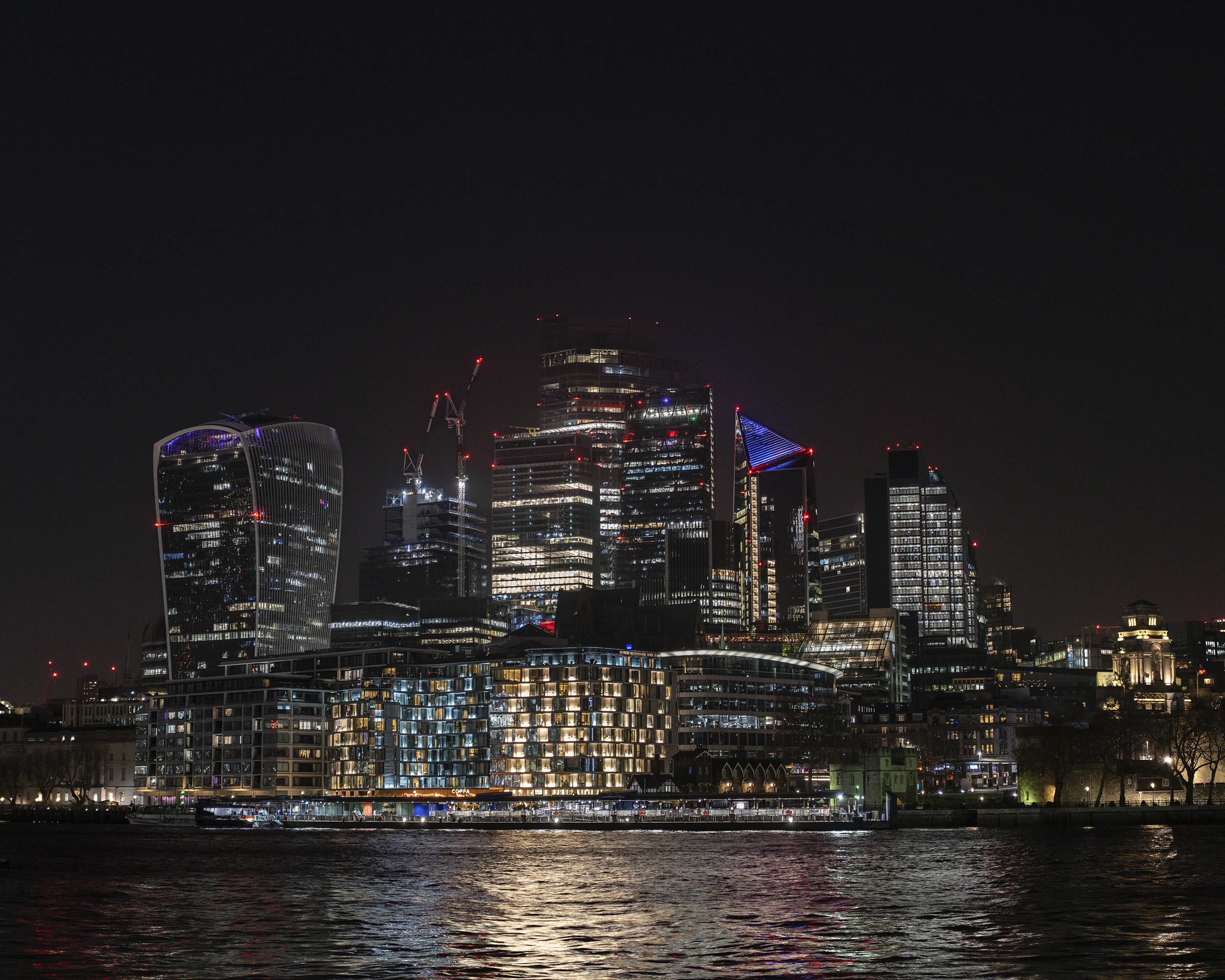Skyline Londons bei Nacht mit erleuchteten Gebäuden © Matija Vincek | Sony α7CR + FE 24-50mm f/2.8 G | 1/10s @ f/2.8, ISO 800