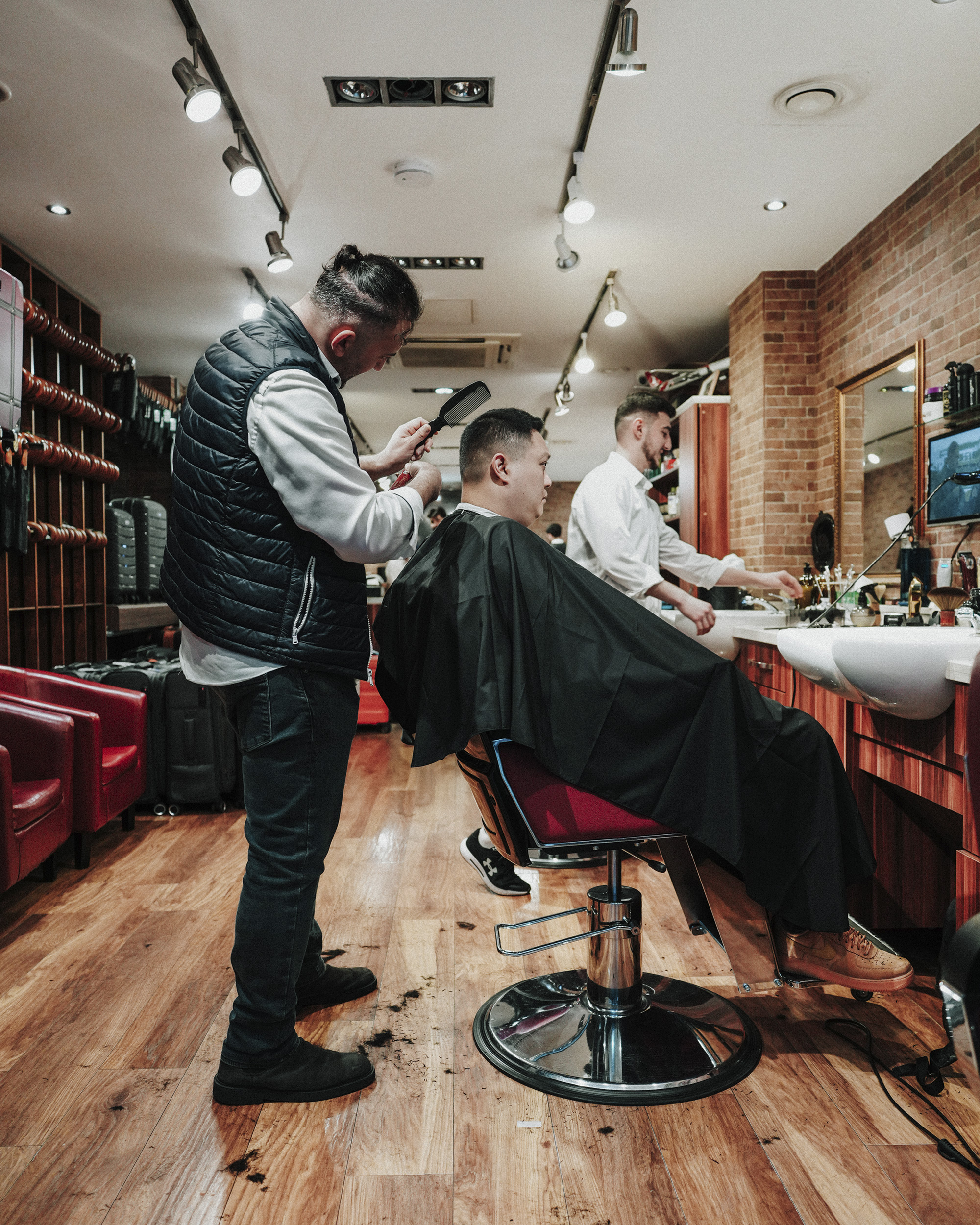 Mann in einem Friseurstuhl erhält einen Haarschnitt © Matija Vincek | Sony α7CR + FE 24-50mm f/2.8 G | 1/250s @ f/2.8, ISO 1600