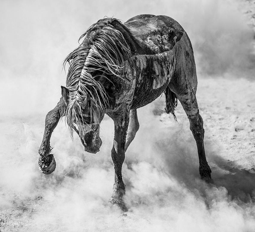 Wilson erhält den Titel für sein eindrucksvolles Bild „Anger Management“ (Aggressionsbewältigung), das er in der Kategorie Natur und wilde Tiere eingereicht hatte. Das Schwarzweißfoto, aufgenommen im Nordwesten Colorados, zeigt einen wilden, schmutzbedeckten Mustang, der eine Staubwolke aufwirbelt. Das Bild entstand, kurz nachdem der Hengst in ein Schlammloch gesprungen war – um sich vor sommerlichen Insekten zu schützen – und als er gerade auf den Boden stampfte, um Konkurrenten wissen zu lassen, dass er bereit war, um seinen Platz an einer nahegelegenen Wasserstelle zu kämpfen.