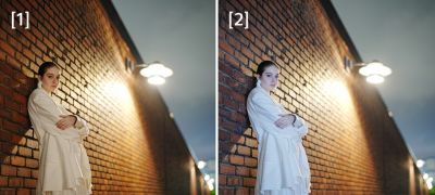 Wenn einer der mitgelieferten Farbfilter an die Blitzeinheit angeschlossen ist, wird der Weißabgleich der Kamera automatisch angepasst, um eine natürliche Kombination aus Blitz und Umgebungslicht zu erzeugen. [1] Blitz mit Farbfilter [2] Blitz ohne Farbfilter