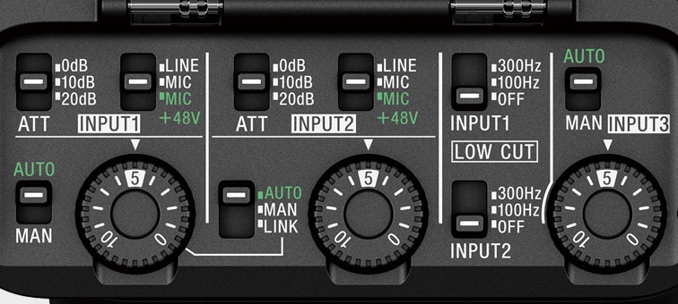 Umfassende Steuermöglichkeiten während der Aufnahme vereinfachen die Nachbearbeitung. Verfügbar sind Steuerelemente für Aufnahmepegel (AUTO/MANUELL), Aufnahmepegel-Verbindung (EINGANG 1 – EINGANG 2), Dämpfung und Hochpassfilter (100/300 Hz).